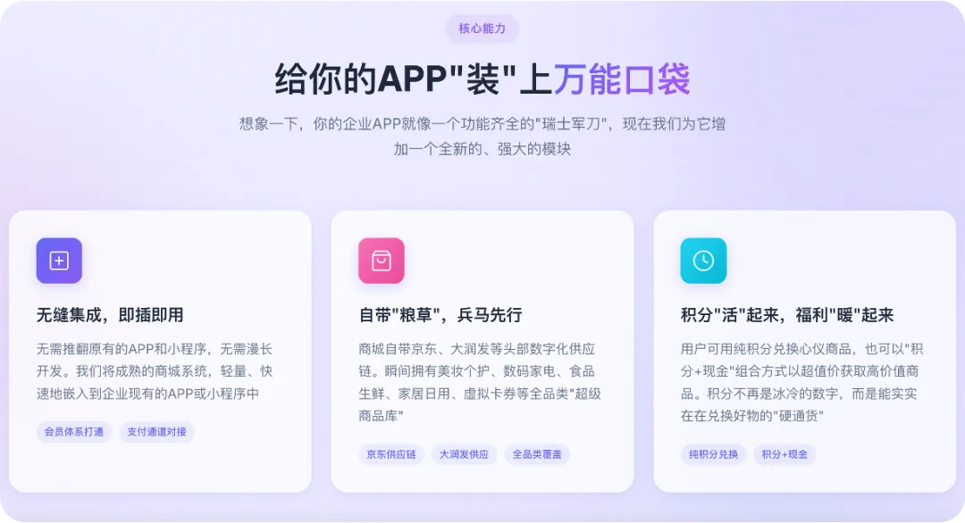想象一下,你的企业APP或小程序,就像一个功能齐全的“瑞士军刀”。现在,我们为它增加一个全新的、强大的新模块——一个自带海量优质商品的积分商城。无需推翻重来,无需漫长开发。就像在微信里打开一个小程序一样,我们将成熟的商城系统,轻量、快速地嵌入到你现有的APP或小程序中。会员体系、支付通道全部打通,用户无感切换,体验流畅。最大的亮点来了!这个商城自带京东、大润发等头部数字化供应链。这意味着,你瞬间就拥有了一个覆盖美妆个护、数码家电、食品生鲜、家居日用、虚拟卡券(油卡、话费、视频会员)等全品类的“超级商品库”。企业无需自建仓库、无需操心采购和库存,供应链的所有苦活累活,我们和合作伙伴帮你搞定。你之前发放的、可能已被用户遗忘的积分,终于找到了最佳的“消费场景”。用户可以用纯积分兑换心仪商品,也可以用“积分+现金”的组合方式以超值价获取高价值商品。基于多年为知名高端品牌提供积分运营业务的经验,商派也推出了一站式的积分商城运营服务。从此,积分不再是冰冷的数字,而是能实实在在兑换好物的“硬通货”,会员粘性和活跃度直线飙升。二、对企业而言,这不止是积分商城