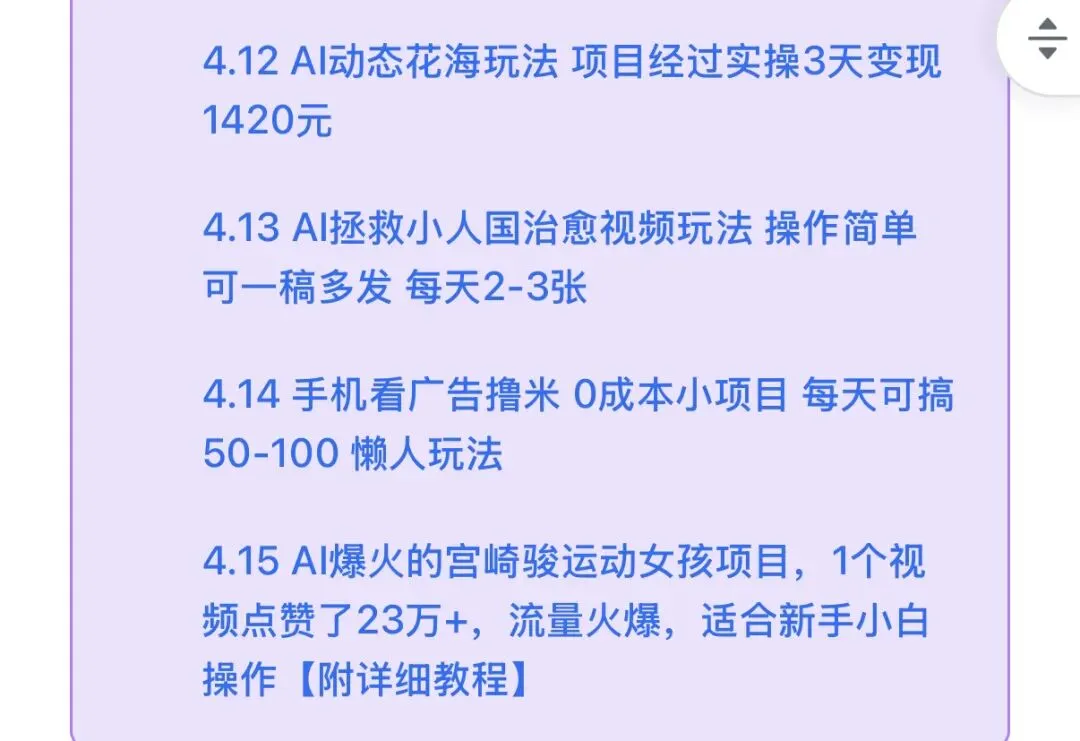 最近一直在分享关于Ai项目的拆解,不知道大家都看过没有。今年的AI项目真可以说是分生水起了,各种小项目层出不穷。我给大家分享的呢,都是能够实操落地的,希望能够让大家省去找项目的时间,能够少走弯路!
