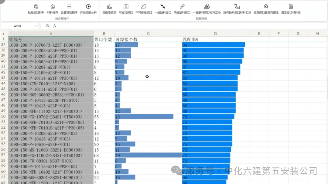 在自动焊预制计划编制阶段,项目利用人工智能材料分配算法,自动模拟分配每个管道焊口的材料匹配率,每条管线的可预制率,确保出库材料100%可组对焊接,为项目编制施工计划提供精准数据支撑,避免传统管理模式发料后管道焊口无法拼接组对现象造成的材料积压浪费,改进传统靠经验判断的发料的做法。