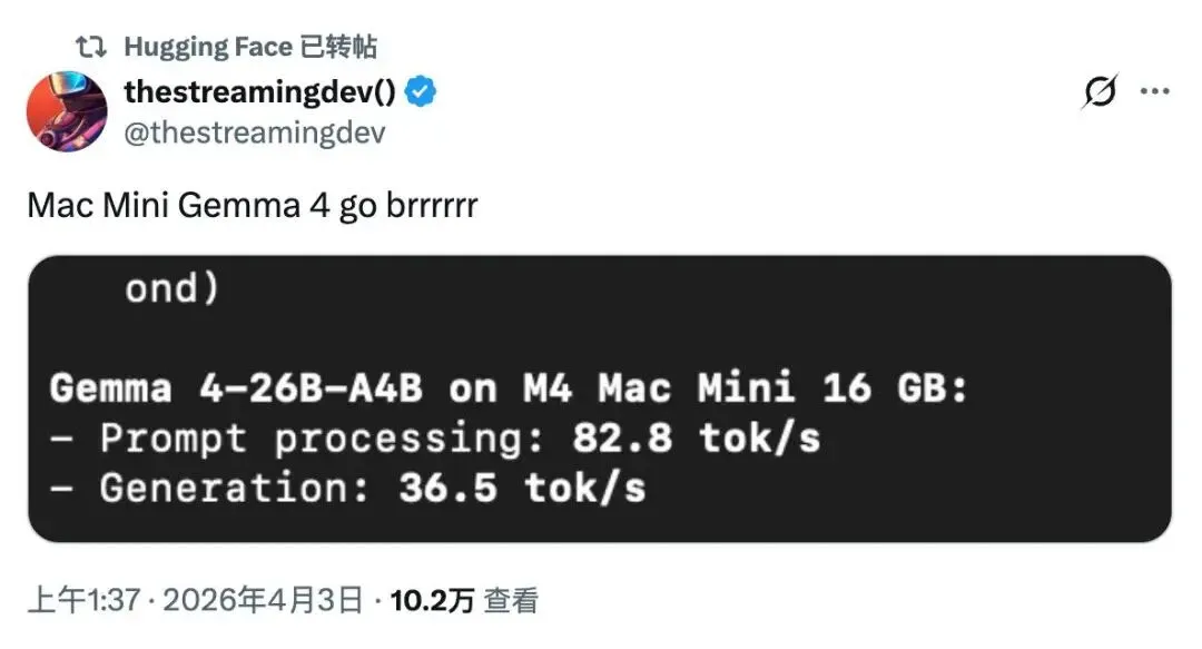 Gemma 4有个轻量版本,Mac mini上两行命令直接拉下来。完全离线运行,不联网,不调API。