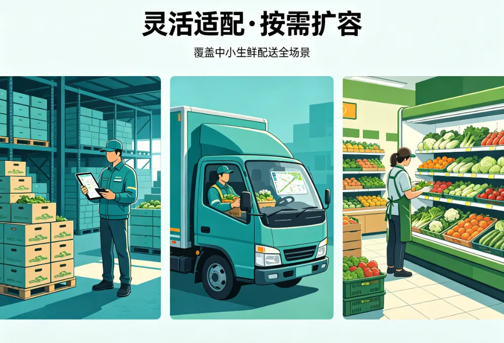 生鲜配送多在凌晨开工,系统出问题没人管,整批货物都可能砸手里,因此24小时售后响应至关重要,蔬果云专属售后团队,凌晨故障15分钟内响应,全程护航业务运转。同时要关注系统适配性,不同规模、不同场景的配送需求不同,中小配送商无需追求“定制化”,但要确保系统能灵活适配业务,支持功能扩容。