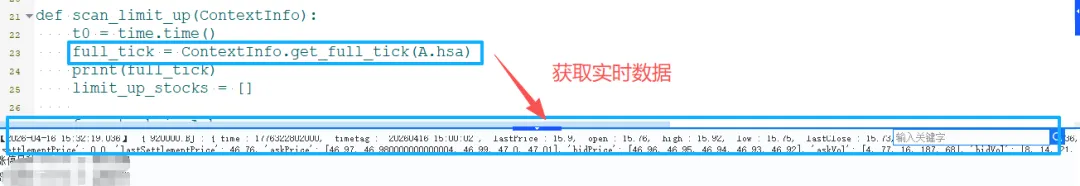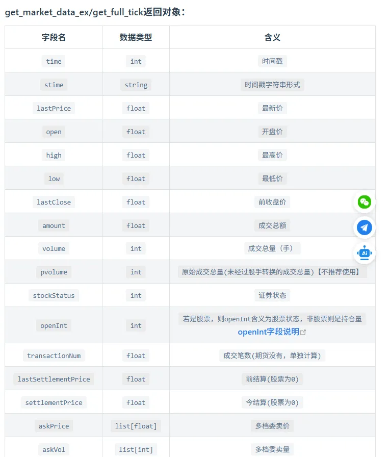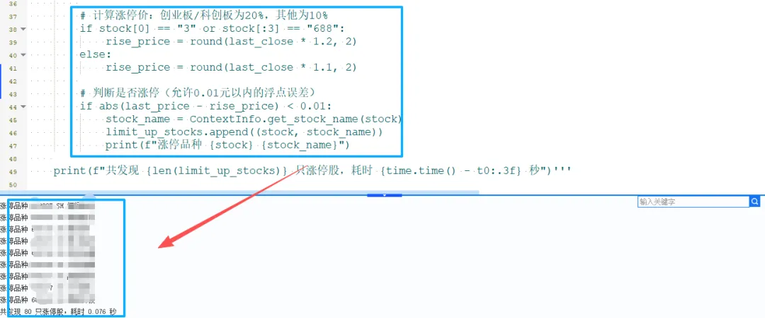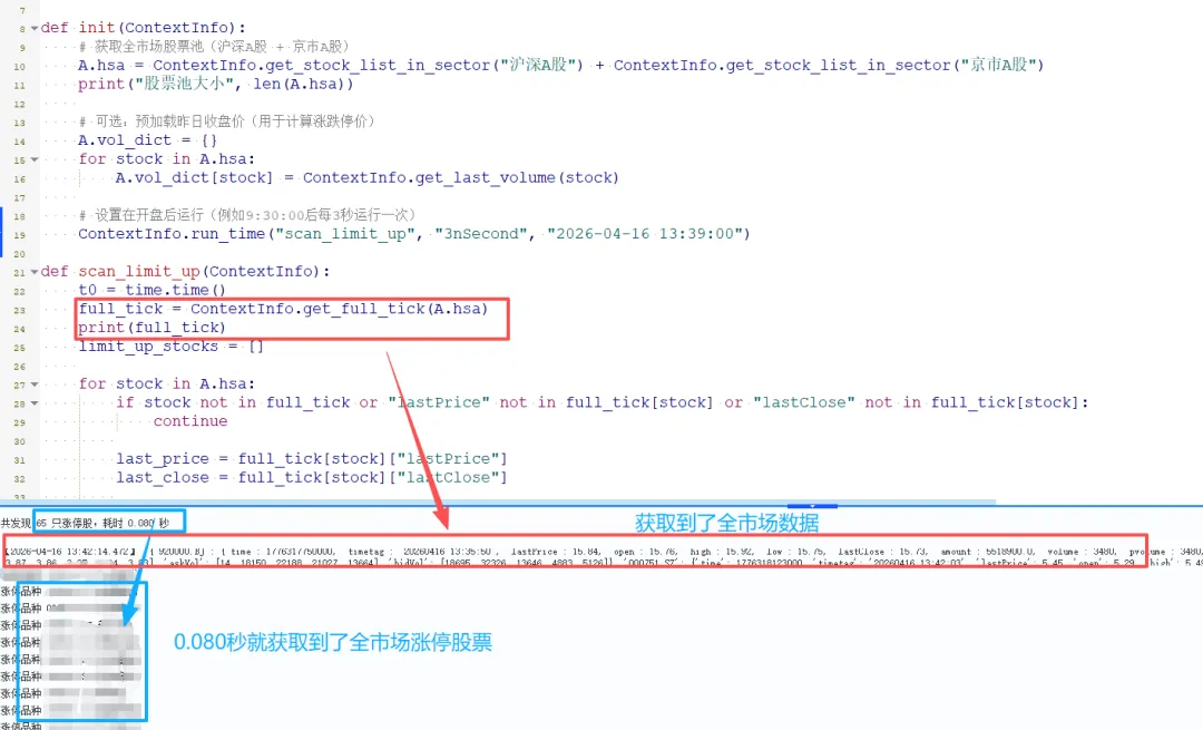 QMT量化软件(09)-get_full_tick函数,自动监控多只股票嗨,我是小九。文章仅作分享,没有任何投资建议。投资不能靠感觉,量化分析是王道。大家在研究股票的时候有没有遇到过这样的问题:自选股里面加了50只股票,开盘后想盯哪只突然拉升、哪只放量。但是看了这只就看不到那只,恨不得长50双眼睛一起看。我以前也是这样。但是现在轻松多了,用QMT的get_full_tick函数接口写了一个小策略:同时监控所有自选股(假设全市场股票),一旦某只涨幅超过X%(假设涨停),自动提醒。先看看运行结果:结果很快就出来了。那具体是怎么操作的呢?首先要理解这个函数接口:get_full_tickget_full_tick(stock_code=[])用于获取最新分笔数据。里面的参数stock_code=[]用于传入股票代码。返回值:字典结构,{code: {field: value}},包含lastPrice(最新价)、open(开盘价)、askPrice(五档卖价)、bidPrice(五档买价)等20多个字段。更新频率:50ms一次,即1秒更新20次,远超人工盯盘速度。但是需要注意的是:如果全推数据每50ms更新一次,若回调函数计算复杂,CPU会100%卡死。解决方案:可以在回调中加time.sleep(0.1),将更新频率降至100ms。然后就可以写代码了,代码逻辑:1、使用get_stock_list_in_sector函数接口获取全市场股票代码作为自选股。2、用get_full_tick接口获取实时数据。3、对数据进行处理,计算涨停价,判断是否涨停。使用场景:场景1:开盘涨停股扫描(打板策略)9:25集合竞价结束后,需在3秒内找出所有涨停股。若用subscribe_quote逐个订阅5000只股票,耗时>15秒,机会已逝。场景2:板块异动预警当某板块5分钟内涨幅>X%时,需第一时间找出龙头。全推数据可以实时计算板块指数,无需轮询。场景3:全市场风控监控监控股票是否出现"黑天鹅"(如闪崩、停牌)。大家还知道有哪些场景吗?可以评论区一起交流。
