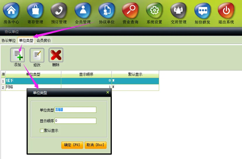 1.登陆中顶客房软件前台营业主界面,点开【协议单位】按钮,先添加协议单位类型