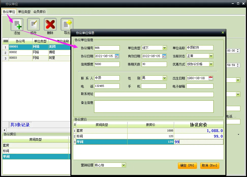 再添加协议单位,添加协议单位时,填写协议单位信息,以及修改协议房价,确定完成.