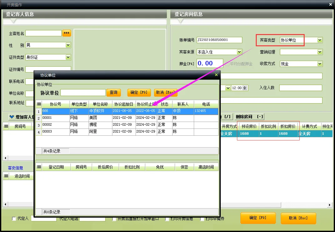2.再回到中顶客房软件前台营业主界面,进行开房操作,在开房界面,选择协议单位,确定
