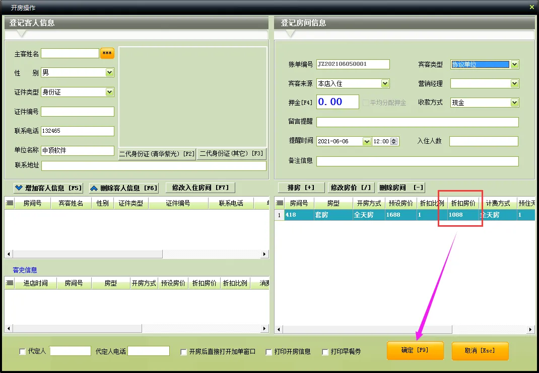 这样房价会自动执行前面设置好的协议房价,最后点确定完成开房操作.
