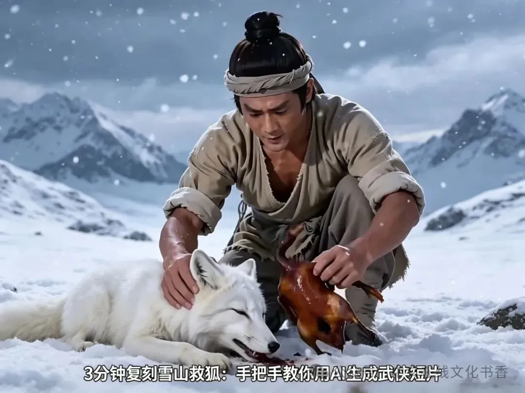 故事的起点很简单:一位网友用AI制作了一部邵氏武侠风格短片。侠客在雪山救下一只濒死白狐,担心它挨饿,留下一只酱板鸭过冬。
