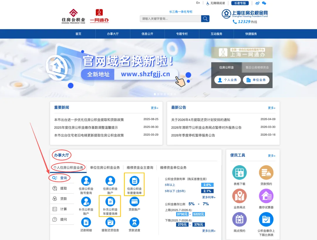 第一步:用电脑打开浏览器,访问新版“上海住房公积金网“ ⚠️ 注意!旧地址 m.shgjj.com 已经不再使用,记得更新书签。👉 新官网地址:https://www.shzfgjj.cn/第二步:进入首页后,在”办事大厅“找到个人住房公积金业务——查询根据需要查询的具体项目,选择住房公积金年度查询单(或补充公积金年度查询单)。