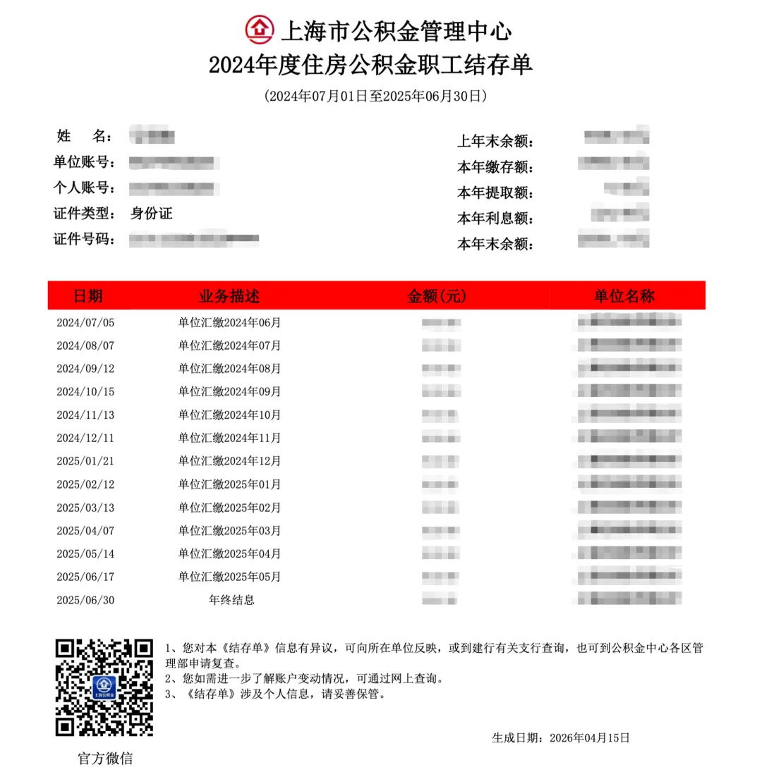 很多朋友下载后会疑惑:明明每个月都在缴,今年的记录去哪了?表上怎么只显示到去年6月就断了?这是因为:公积金年度结存单的统计周期并非自然年(1月-12月),而是上一年7月至当年6月。 这是公积金管理中心的统一结算规则。目前我们能调取到的最新结存单是2024年度,即2024年7月~2025年6月。2025年度(25年7月至26年6月)的结存单要等到今年7月之后才会生成。1、留在第三步“点击下载”的页面不要离开,点击网页最上方的账户查询→住房公积金账户(or补充住房公积金账户)2、仍然以住房公积金为例,进入账户总览页面,点击“查看账户明细”虽然这个页面没有直接生成PDF的功能,不过熟悉电脑操作的朋友们可以直接CTRL+P把整个页面都保存为PDF,也是非常便利的。2025年4月,上海出台了灵活就业人员公积金新政,已于2025年6月起正式施行:如果你身边有自由职业、个体户的朋友,这条新政值得转给他们看看。公积金不只是打工人的事了。📌 公积金明细,在婚姻财产分割、动迁补偿核算中都可能成为关键证据。很多当事人到了诉讼阶段才想起来要查,结果发现部分年度的记录已经难以完整还原。趁着没有纠纷的时候,把该留的凭证先备好。📬 如果您正面临离婚财产分割、动迁补偿纠纷,不确定公积金在案件中如何计算和主张,欢迎联系家承律师。我们帮您理清每一笔账,把该拿的钱一分不少地拿回来。