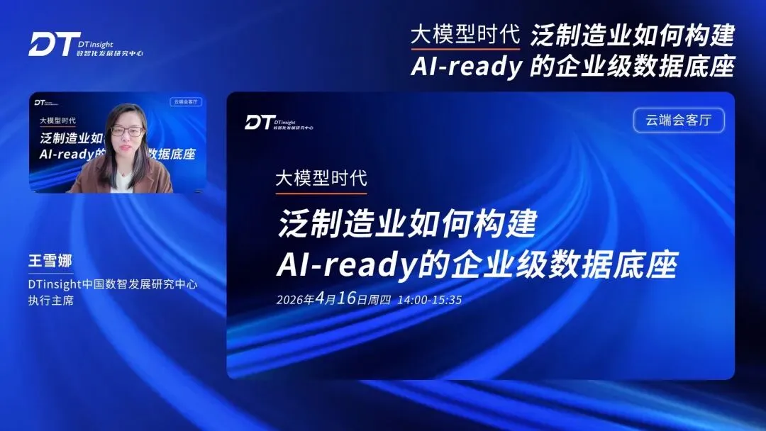 本次直播由DTinsight中国数智发展研究中心执行主席王雪娜主持,她表示,当下,大模型技术正推动泛制造业 AI 应用从试点探索走向规模化落地。但现实中,生产线实时传感数据、设备时序数据、跨工厂协同数据,以及海量历史沉淀数据交织,形成高度复杂的数据环境,让众多企业“想用 AI 却用不好 AI”。从数据到 AI,从来不是简单的技术叠加,而是一场覆盖架构、治理与能力的系统性升级。