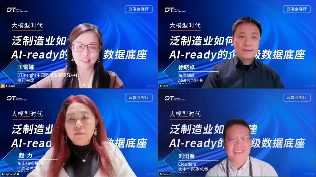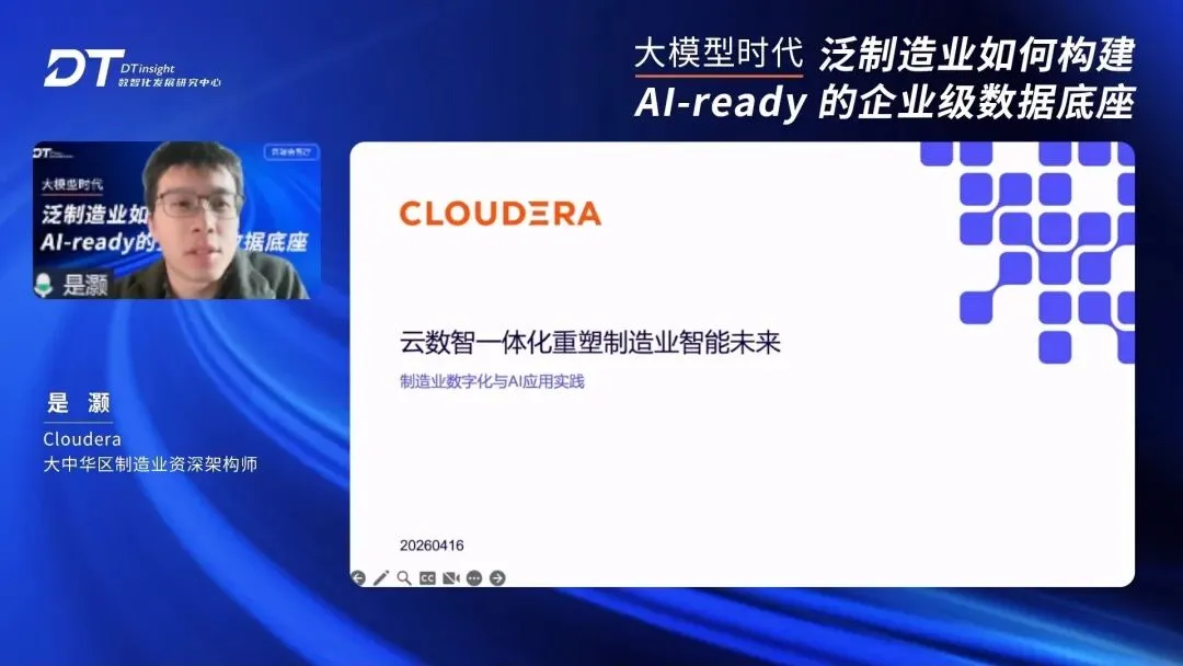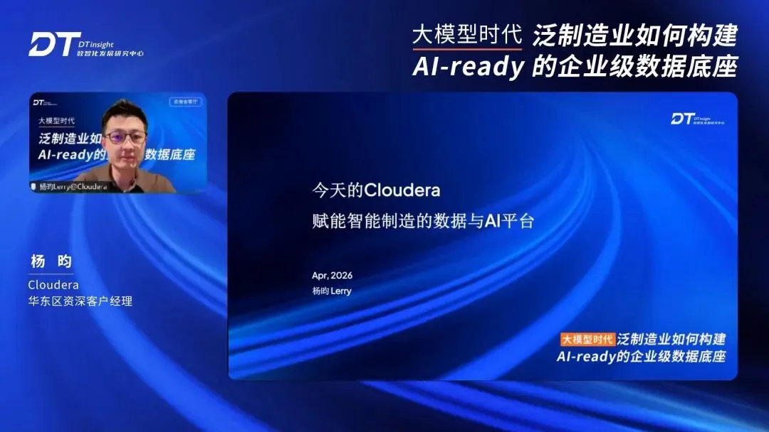 为帮助泛制造业构建AI-ready的企业级数据底座,夯实AI创新所需的高质量、可信数据基础,4月16日,DTinsight中国数智发展研究中心举办【云端会客厅】线上直播,特邀东山精密集团IT高级总监赵力、海辰储能AI研究院院长徐晓卓、Cloudera大中华区副总裁刘汨春、Cloudera华东区资深客户经理杨昀、Cloudera大中华区制造业资深架构师是灏做客直播间,以“泛制造业如何构建AI-ready的企业级数据底座”为主题,聚焦AI与数据融合发展、直面泛制造业面临的数据困惑,揭秘企业如何企业构建高质量、可靠可信数据底座,为AI时代做好准备。