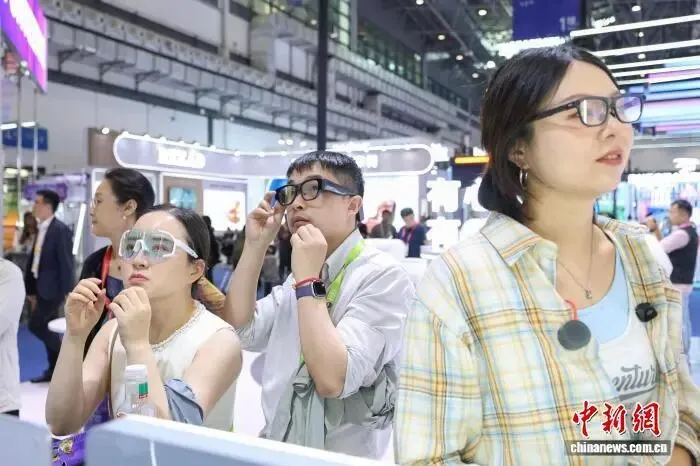 4月14日,参观者在淘天集团展区试戴多种款式的AI眼镜。记者杨郁然 摄