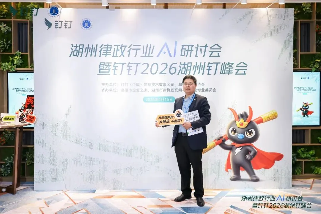 2026年4月16日下午,浙江圣港(湖州)律师事务所主任张伟华律师参加在湖州南太湖诺富特酒店举办的湖州律政行业AI研讨会暨钉钉2026湖州钉峰会。