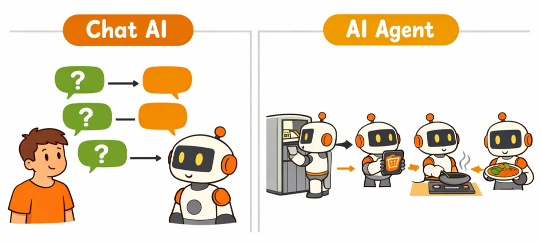 你想想看,普通的Agent聊天就像你问一个朋友「这个菜怎么做」,他告诉你步骤,但他不会真的去厨房帮你做。