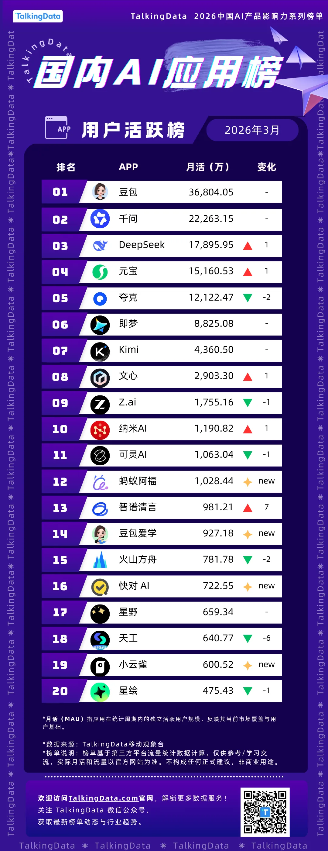 TalkingData 基于自研的多源数据融合算法与移动观象台海量数据监测,发布 《国内AI应用用户活跃排行榜》。该榜单旨在通过客观数据,系统评估国内主流AI应用的用户规模与市场覆盖,为行业提供中立、权威的第三方观察视角。