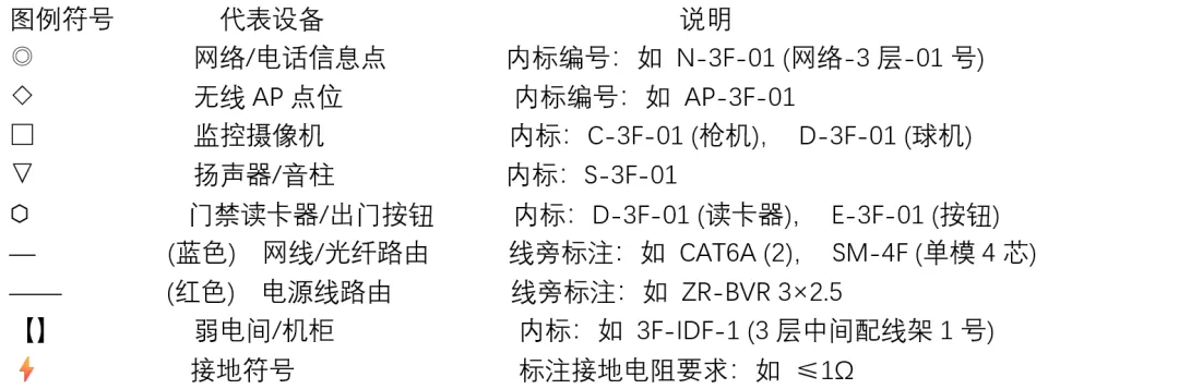 五要素齐全:点位、路由、设备、编号、接地必须全部标注。