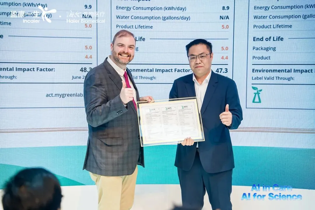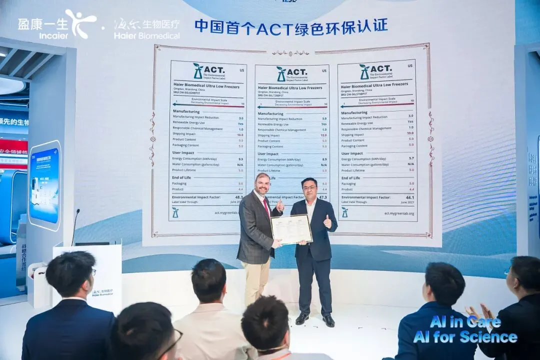 •My Green Lab首席执行官为海尔生物医疗超低温产品颁发ACT绿色环保认证证书
