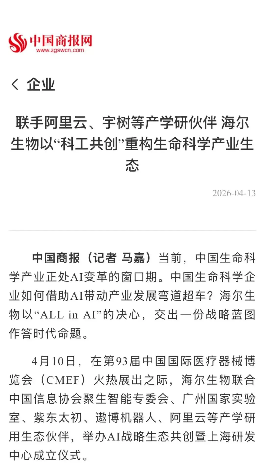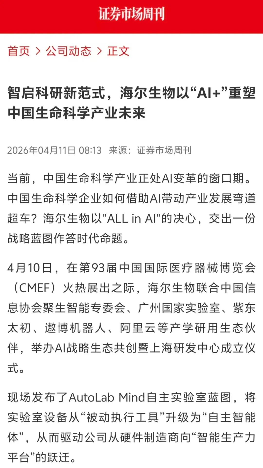 海尔生物医疗,于2019年科创板上市(股票代码:688139),是海尔集团旗下大健康板块盈康一生在生命科学产业的重要战略布局。公司致力于成为全球信赖的生命科学产业世界级品牌,以创用户最佳体验为目标,面向医药生物企业、高校科研机构等生命科学用户和医院、疾控、血站、基层公卫等医疗卫生用户,提供涵盖低温存储、数智科研、智慧用药、血液技术等多个产业领域的数字场景综合解决方案,以AI+自动化深度重构生命科学研发、医疗服务等核心用户场景,推动AI在生命科学领域的加速落地。