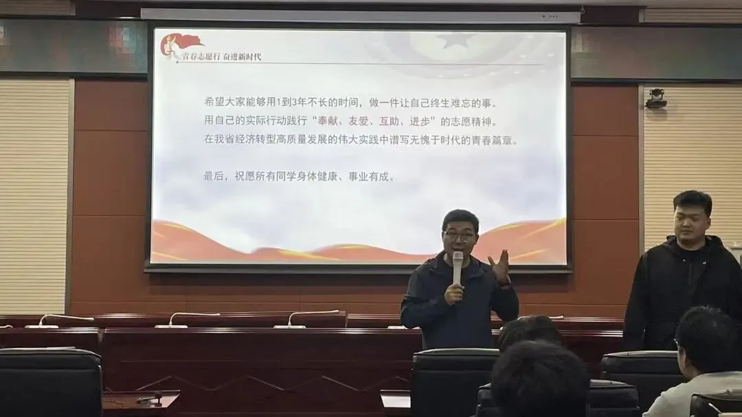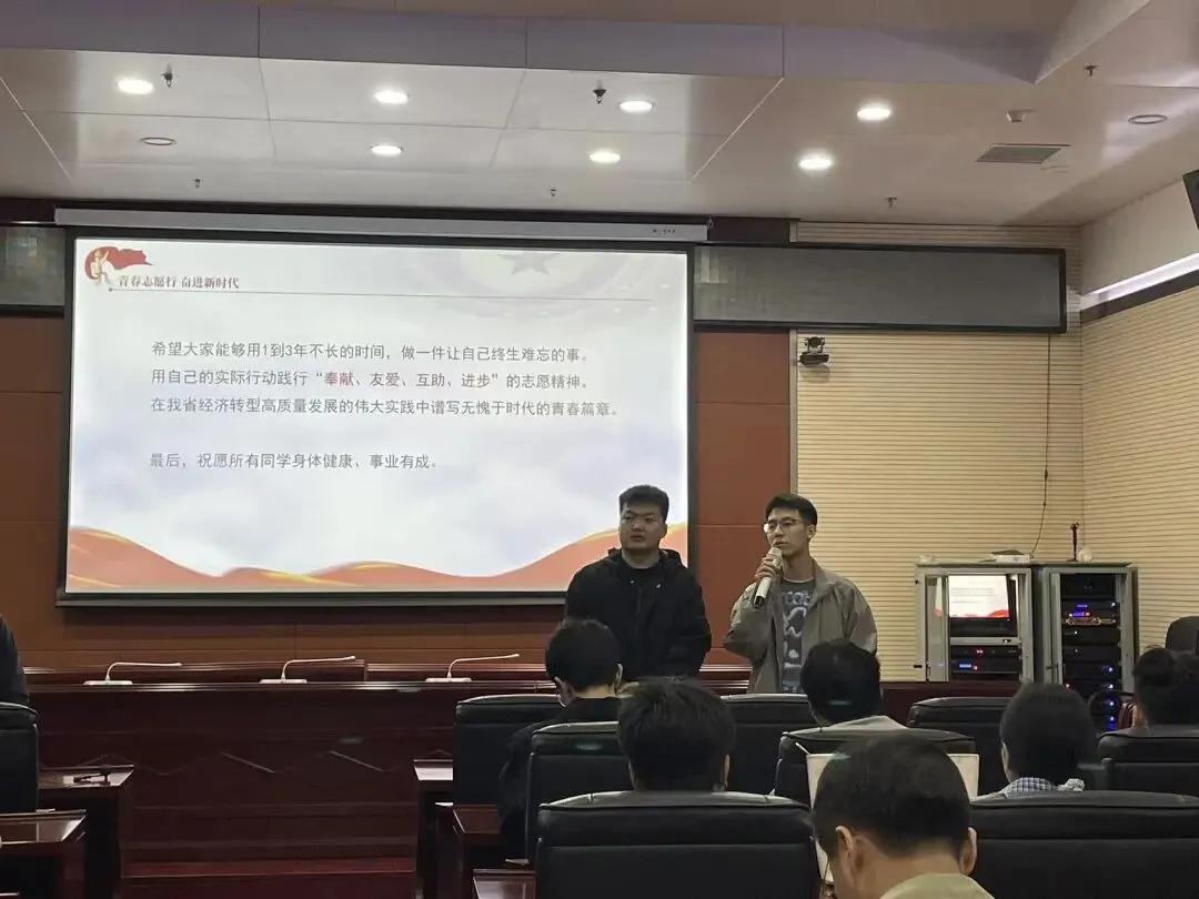 4月13日,学院于龙城校区举办大学生志愿服务西部计划宣讲会。本次会议特邀我院山西省西部计划优秀志愿者齐弘义、连鑫桐主讲,学院分团委书记刘鹏主持,2022级学生代表参会。