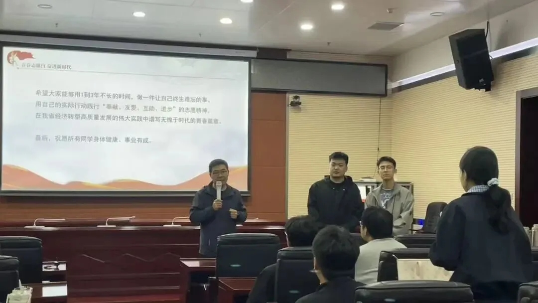 宣讲会上,刘鹏代表学院欢迎齐弘义、连鑫桐返校宣讲,他提到西部计划是青年扎根基层、锤炼本领的重要平台,鼓励同学们结合自身实际和专业特长,以个人所学,应国家所需。