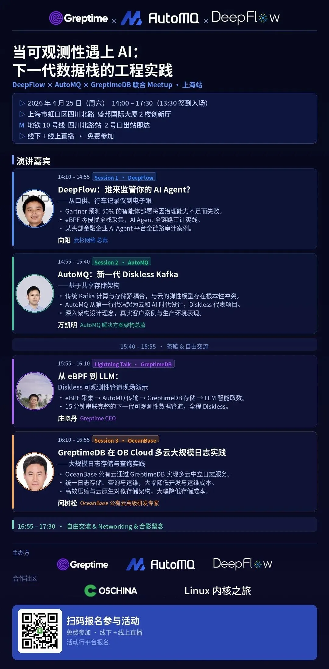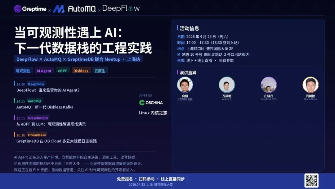 4 月 25 日(周六),DeepFlow、AutoMQ、GreptimeDB 三个团队在上海做一场线下 Meetup,分别从 eBPF 零侵扰采集、云原生 Diskless 消息队列、Metrics/Logs 统一存储三个层面,聊各自在工程上的选择和取舍。OceanBase 公有云的工程师也会分享 GreptimeDB 在多云日志存储中的落地经验。最后 15 分钟 Lightning Talk,把三者串成一条完整管道,现场跑一遍基于 LLM 的智能取数和异常检测。