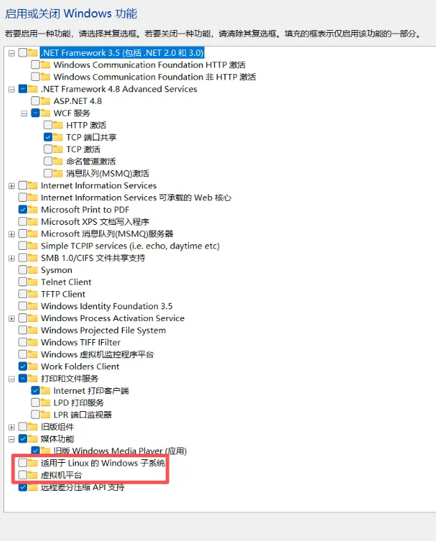 在 Windows 搜索框输入 “启用或关闭 Windows 功能”,打开后找到并取消勾选这两项: