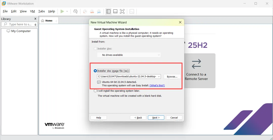 选择 **Installer disc image file (iso)**,点击 Browse,找到并选中你下载的 Ubuntu ISO 文件。识别成功后点 Next。