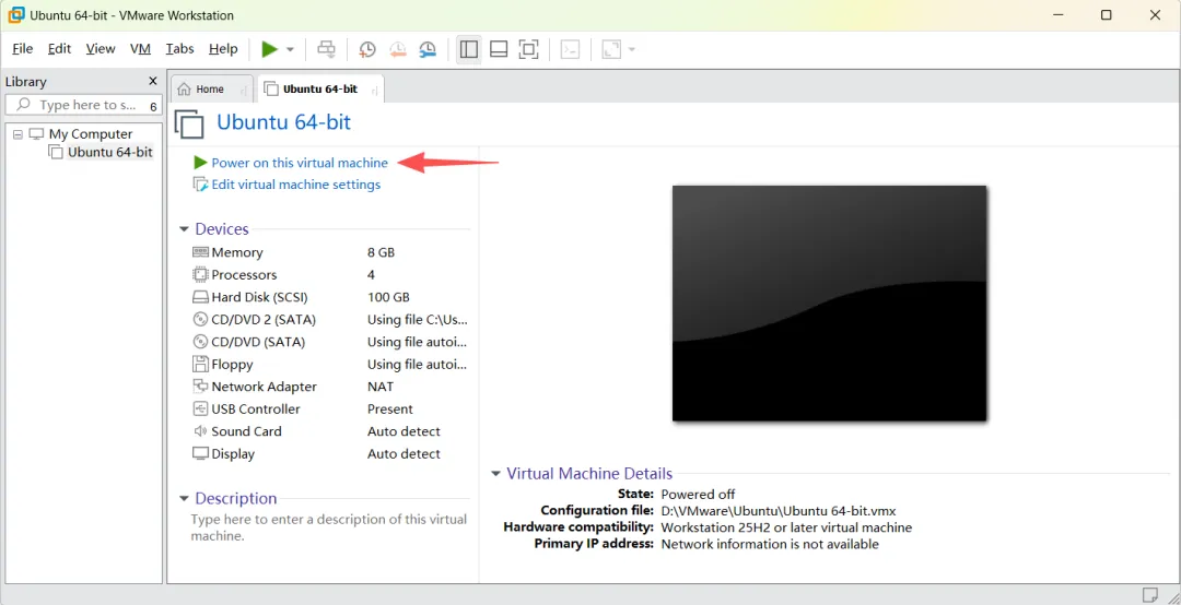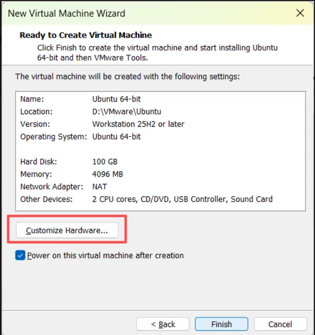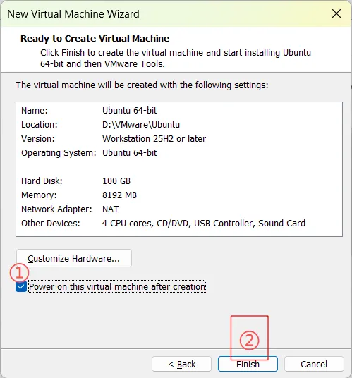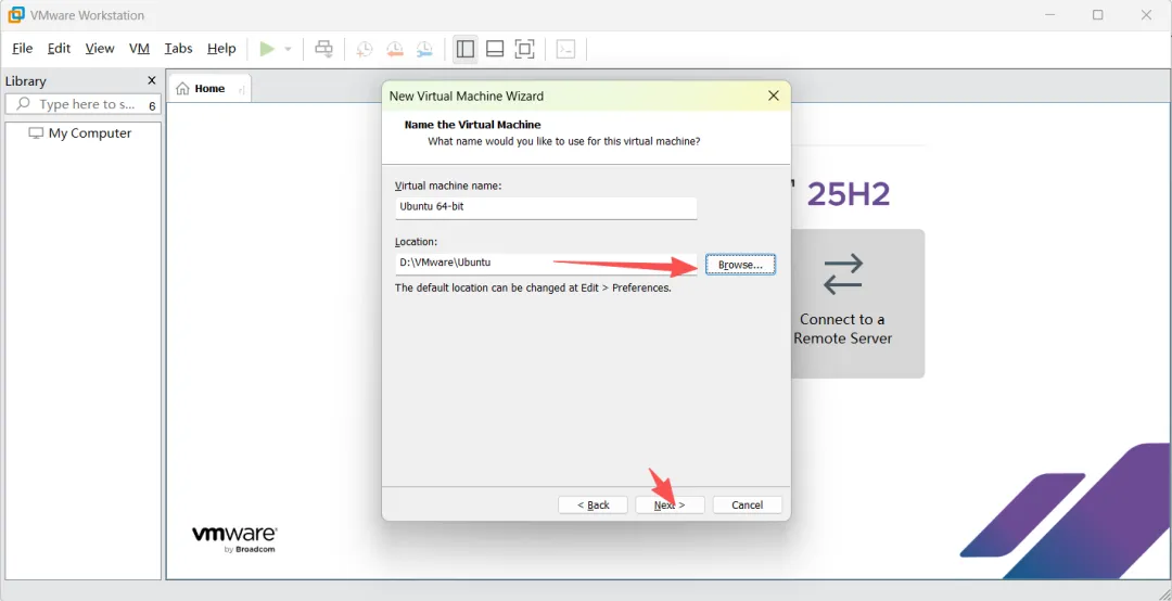 我改到了 D:\VMware\Ubuntu-Hermes。为什么不能放 C 盘? 虚拟机文件会越来越大(轻松几十GB),放在系统盘很快会把空间占满,导致Windows本身运行卡顿。原则:软件装C盘,虚拟机文件放其他盘。