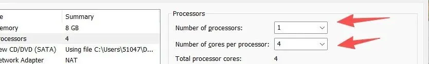 处理器核心数设为 4 核。我的CPU是6核12线程,分4核给虚拟机,既能满足性能需求,又不影响主机多任务处理。