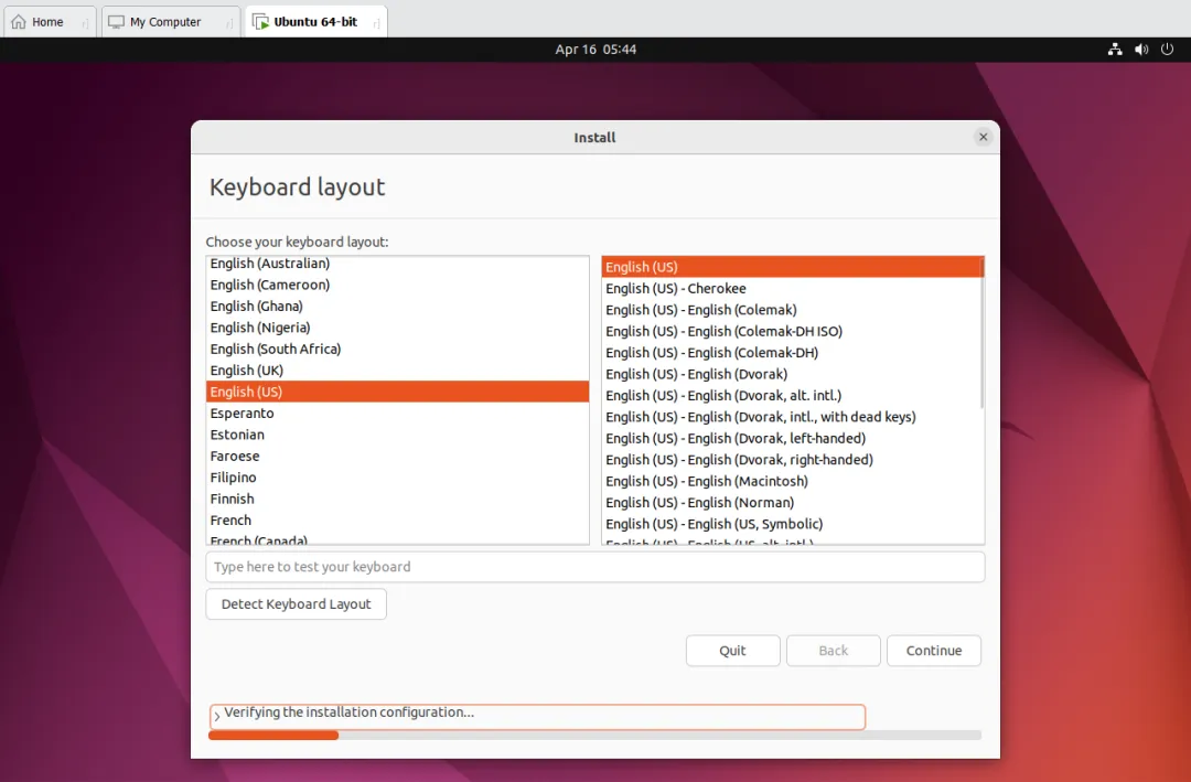 现在,点击 Power on this virtual machine。Ubuntu 安装程序启动后,跟着向导走: