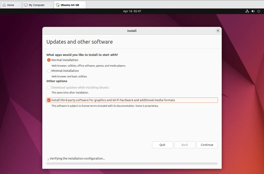选择Normalinstallation和Install third-party software for graphics and witi herdware and additional media formats。
