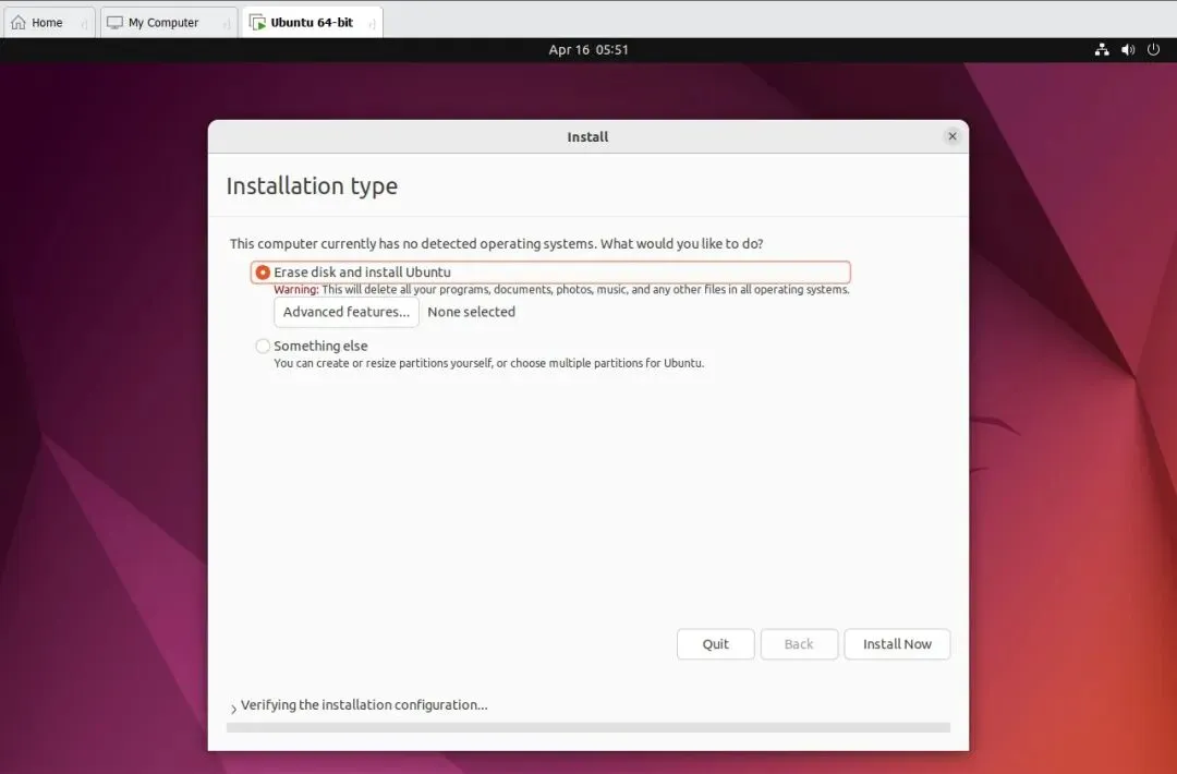 磁盘处理: 选择 Erase disk and install Ubuntu。别担心,这里擦除的是虚拟机内部的虚拟硬盘,不是你真实的Windows硬盘!