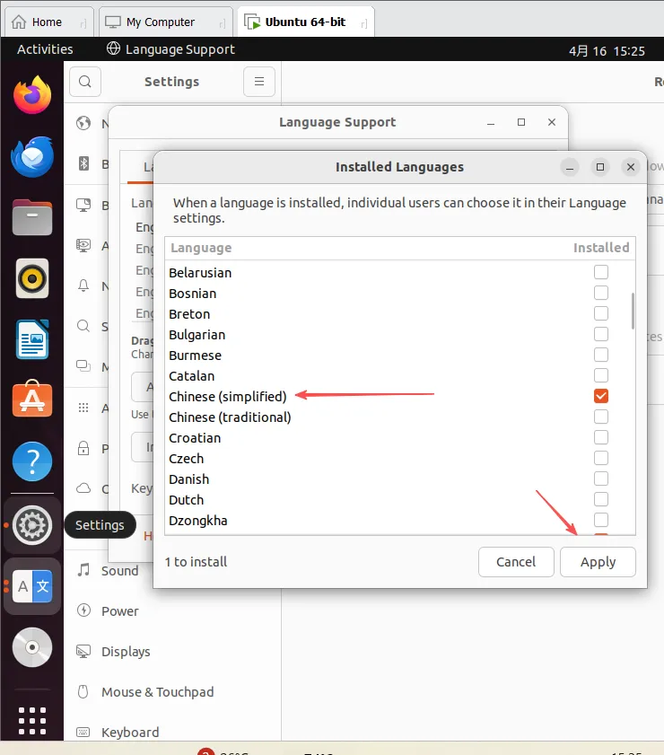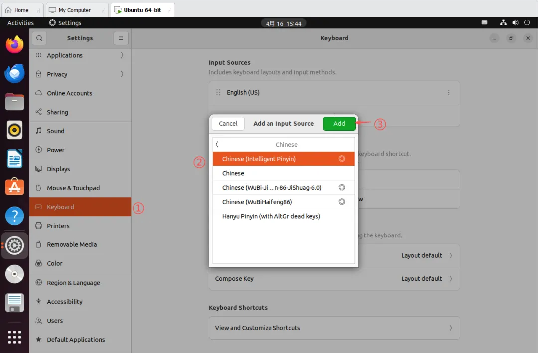 系统重启后,按以下路径操作: 打开 Settings(设置)。进入 Region & Language(区域与语言)。点击 ** Input Sources**(输入源)下的+按钮。在语言列表中找到并选择 ** Chinese**,然后添加Pinyin输入法。