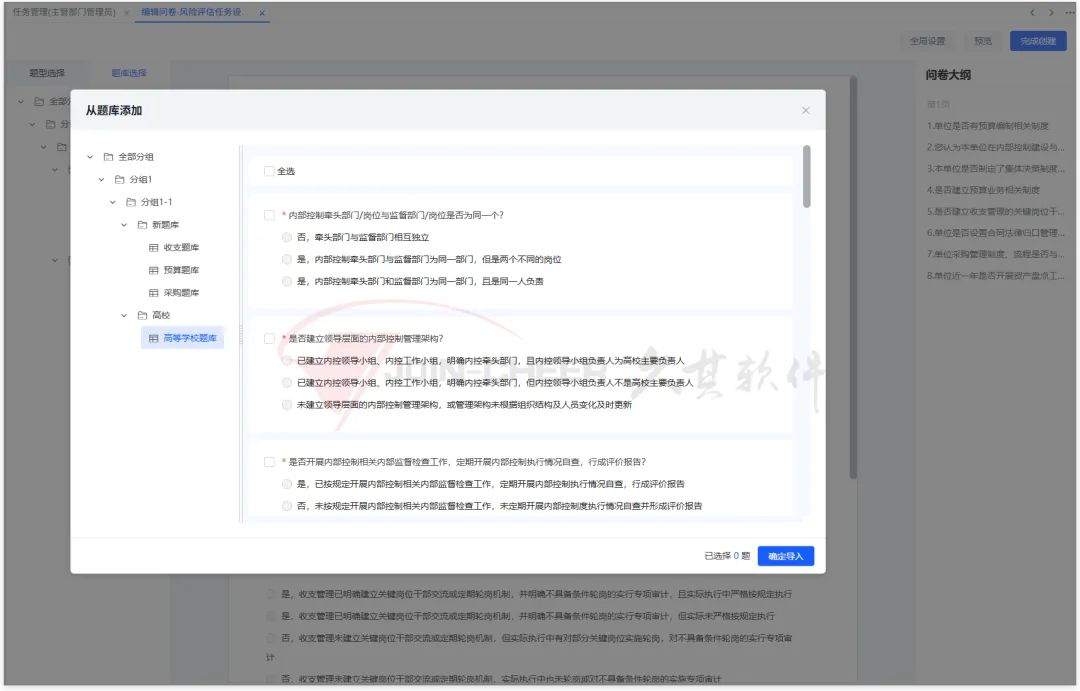 内置教育专属题库253道,覆盖预算、收支、资产、合同、采购、科研、教育基金会等14大核心业务领域,实现从"高风险领域"到"易忽视场景"的全维度扫描。