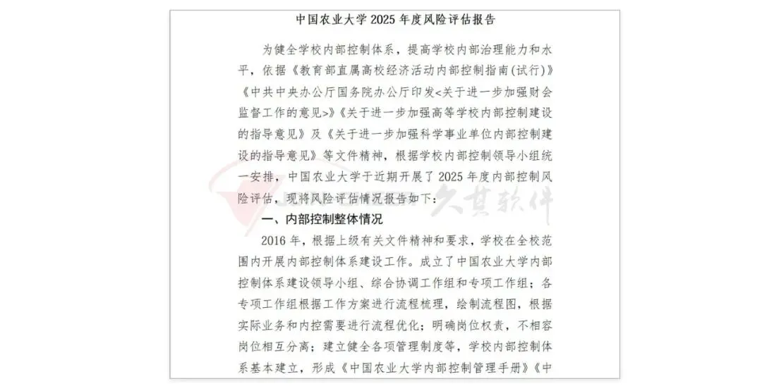 久其软件依托十余年行政事业单位内控积淀,以"信息化+业务"双轮驱动,为中国农业大学量身打造风险评估系统,并以专家团队深度参与业务全过程,让风险评估真正规范高效、精准有效。