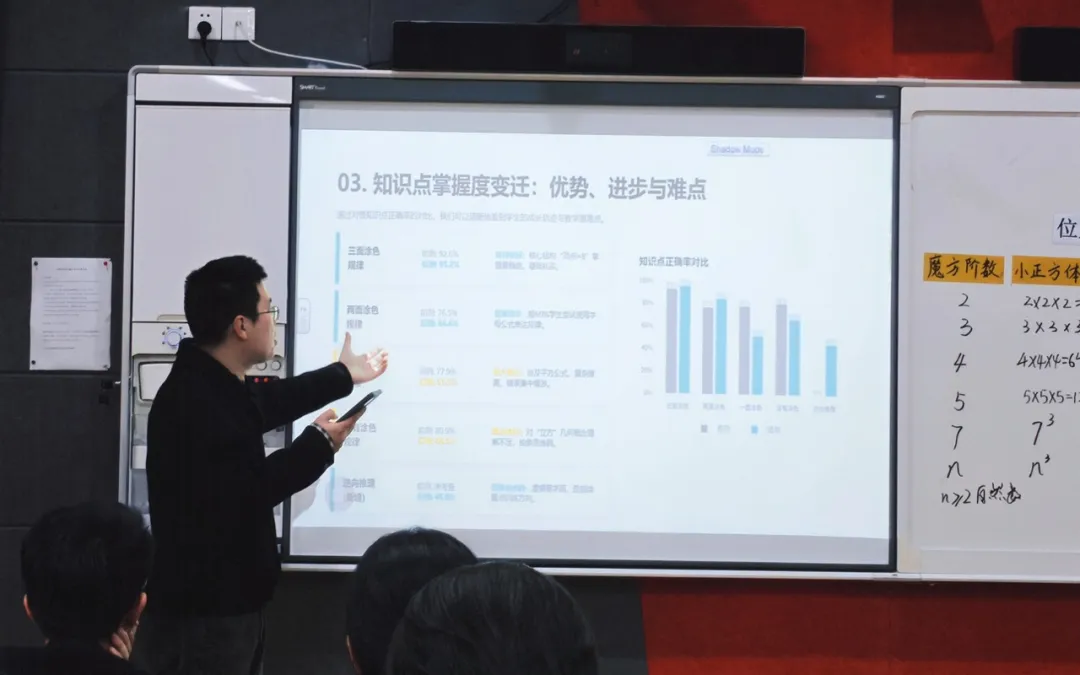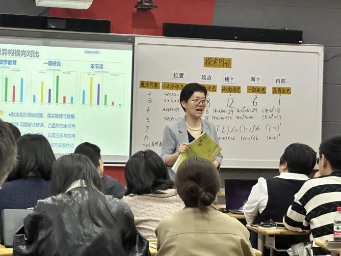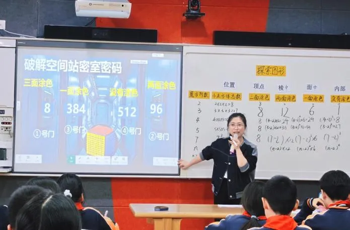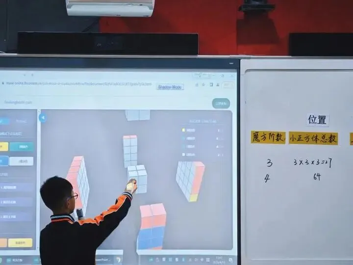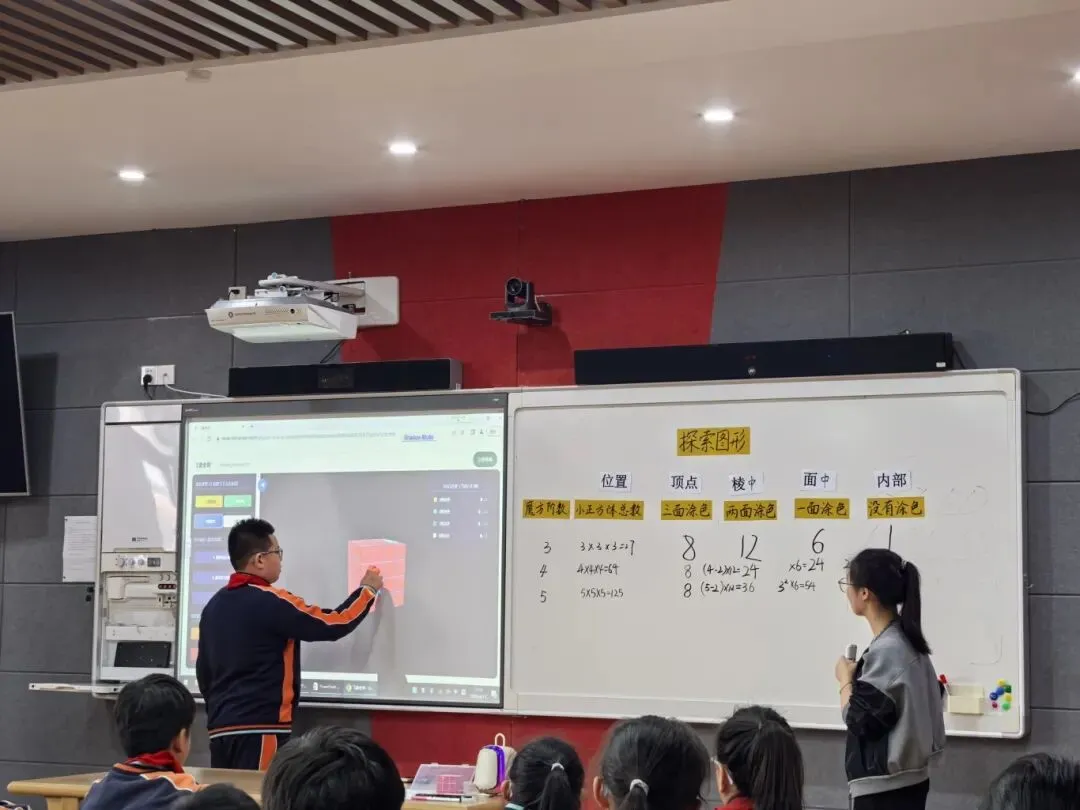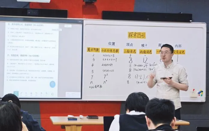 课堂上,赵老师以学生熟悉的魔方为切入点,抛出涂色小正方体的核心问题。随后,引导学生从独立探究到小组合作,一步步拆解三阶、四阶、五阶魔方的涂色规律,在动手操作、观察对比中,逐步归纳出n阶魔方涂色小正方体数量的通用计算公式。