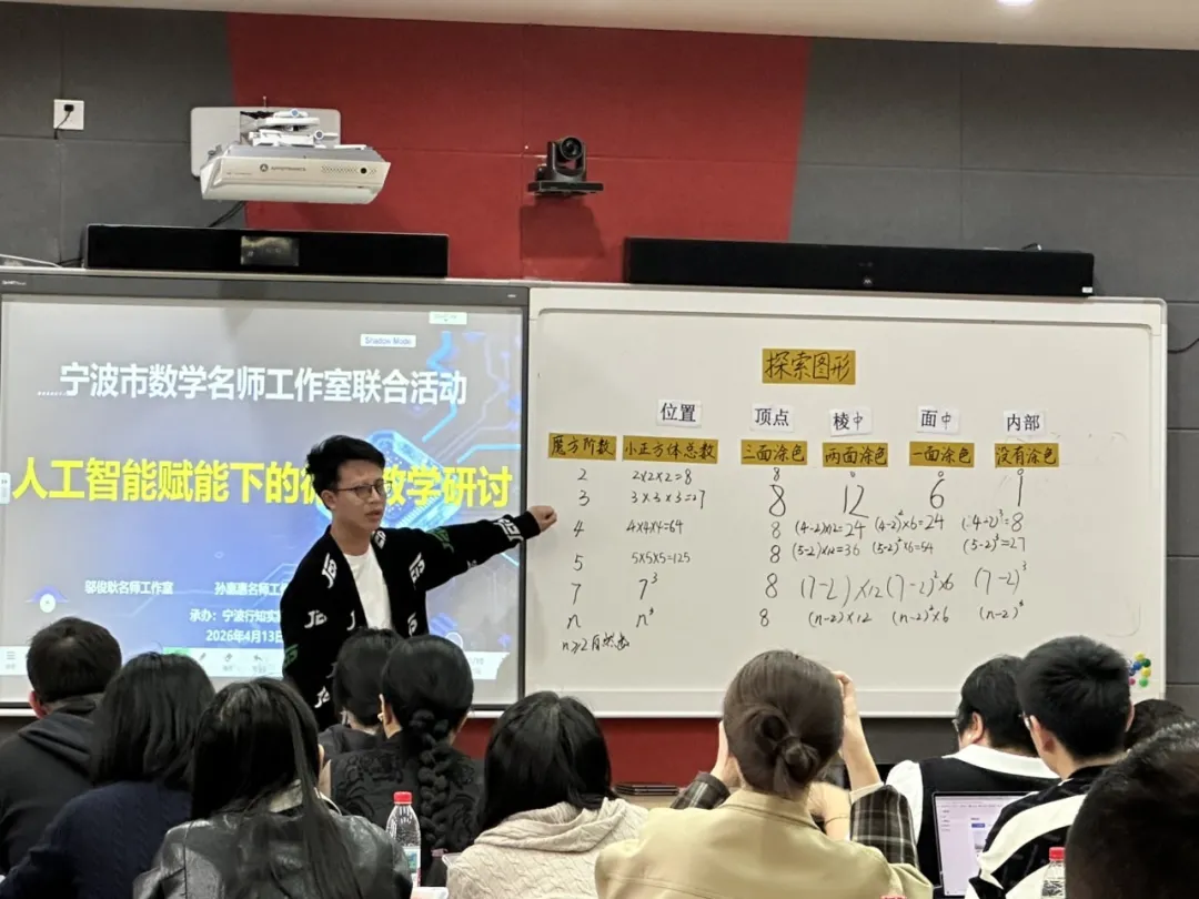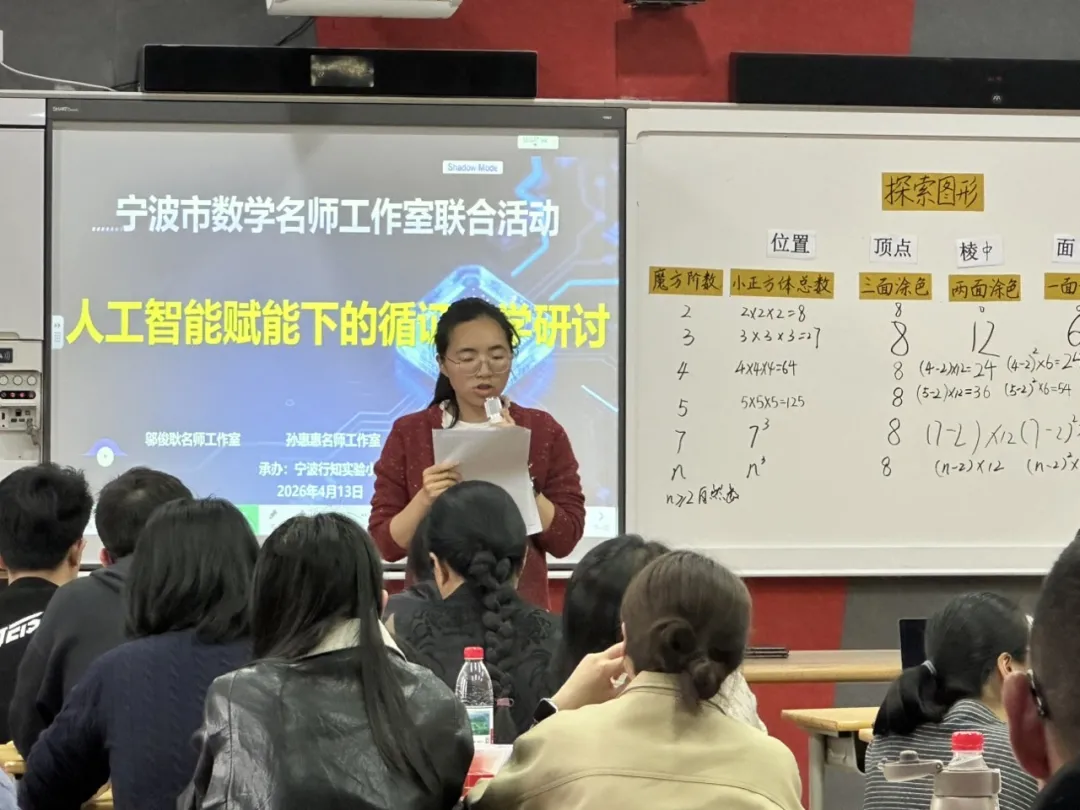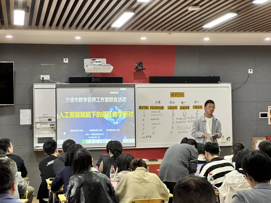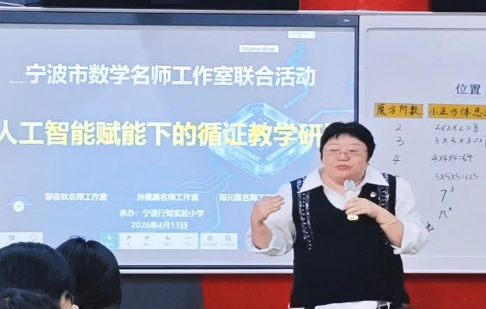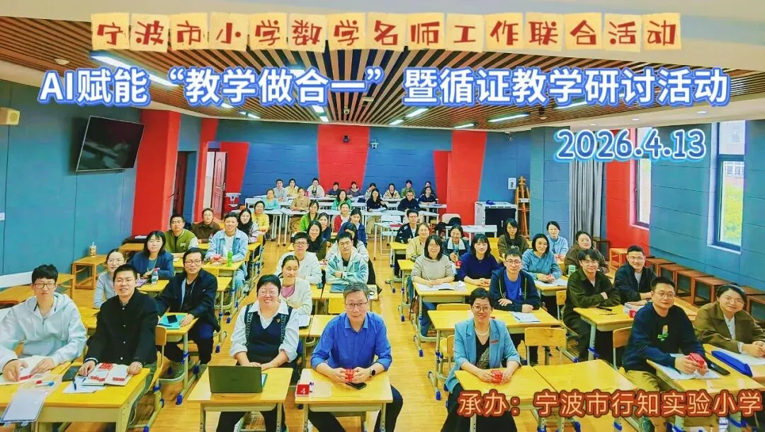2026年4月13日,一场以“AI赋能下的循证教学研讨”为主题的研修活动顺利开展,来自邬俊耿、孙惠惠、陈元隆名师工作室的老师们和宁波市行知实验小学全体数学老师齐聚一堂,以课为媒、以研促学,共同探索AI与课后评价深度融合的新路径、新方法。