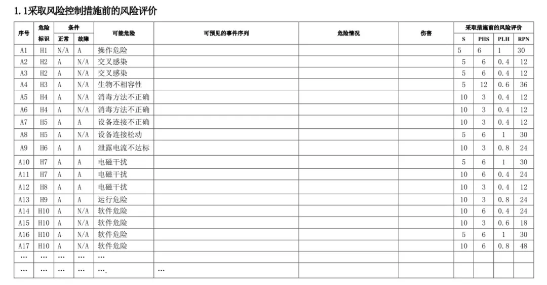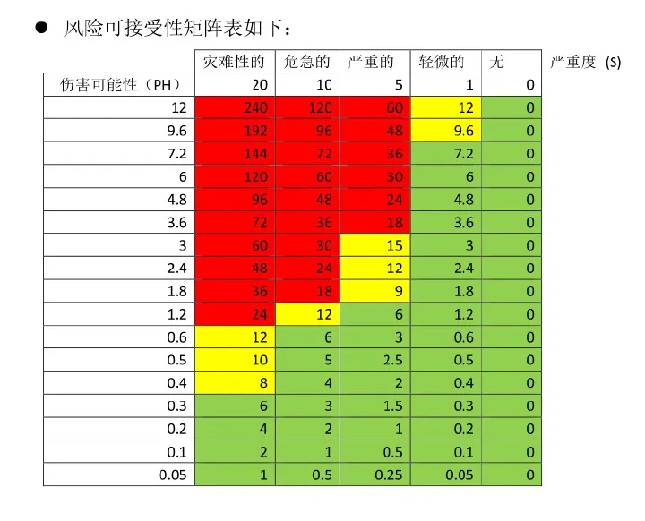风险系数:RPN=S×PH 伤害可能性:PH=PHS×PLH 严重度(S)分级:灾难性 20、危急 10、严重 5、轻微 1、无 0; 风险可接受准则: RPN>15:不可接受,必须采取风险控制措施; 7.5≤RPN≤15:需控制,无措施时需做风险 / 受益分析; RPN<7.5:可接受,鼓励优化但不强制。