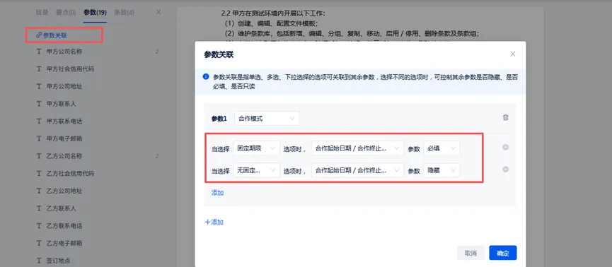 制作模板时可设置:单选 / 多选选项 → 联动其他参数必填 / 只读 / 隐藏,告别手动校验与冗余填写契约锁。