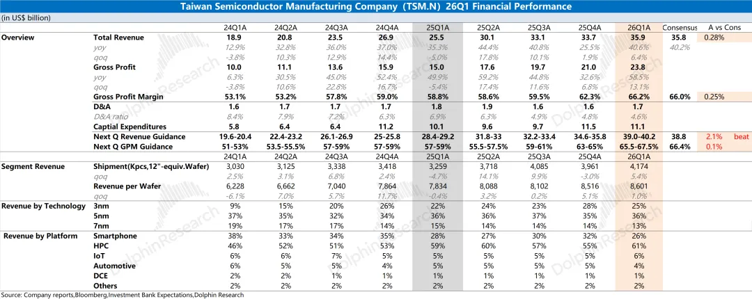 台积电在2026年第一季度实现毛利238亿美元,环比增长13%。其中毛利率66.2%,环比提升3.9pct,接近上调后市场预期(66-66.5%),受均价提升和单位成本下降的双重影响。
