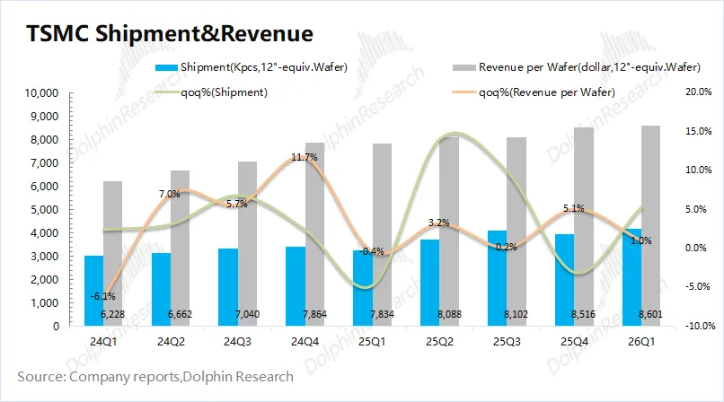 海豚君从量和价的维度,来观察台积电本季度收入增长的主要推动力: