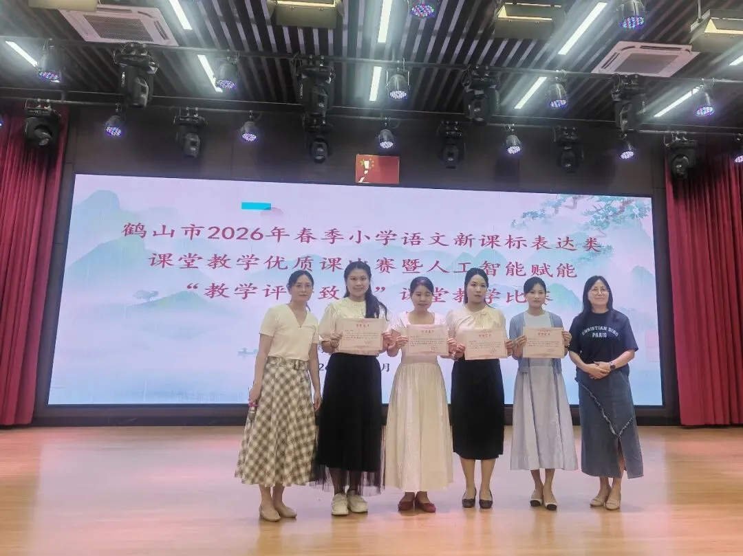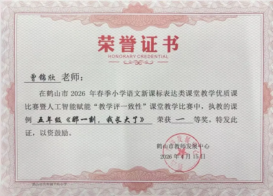 ;2026年4月15日,我镇平岭小学曾锦欣老师在鹤山市2026年春季小学语文新课标表达类课堂教学优质课比赛暨人工智能赋能“教学评一致性”课堂教学比赛中荣获一等奖。