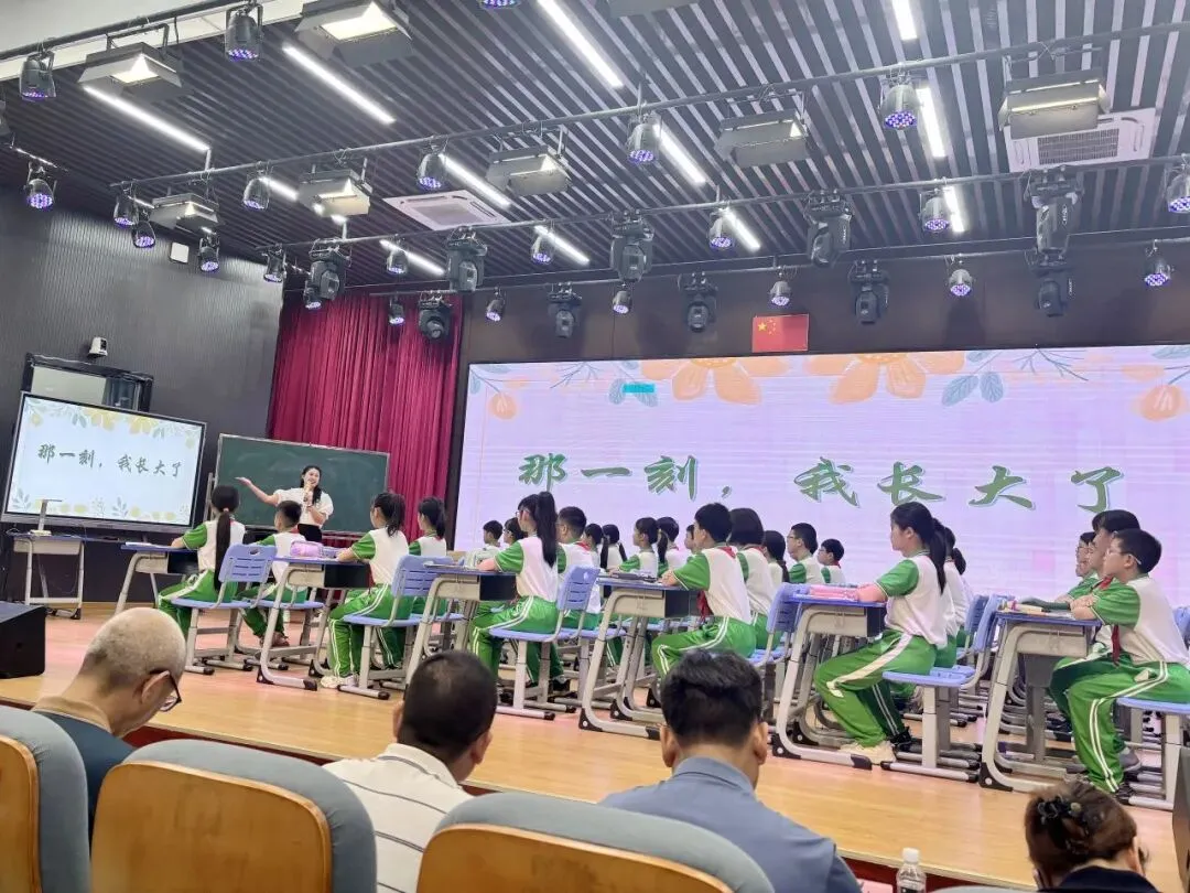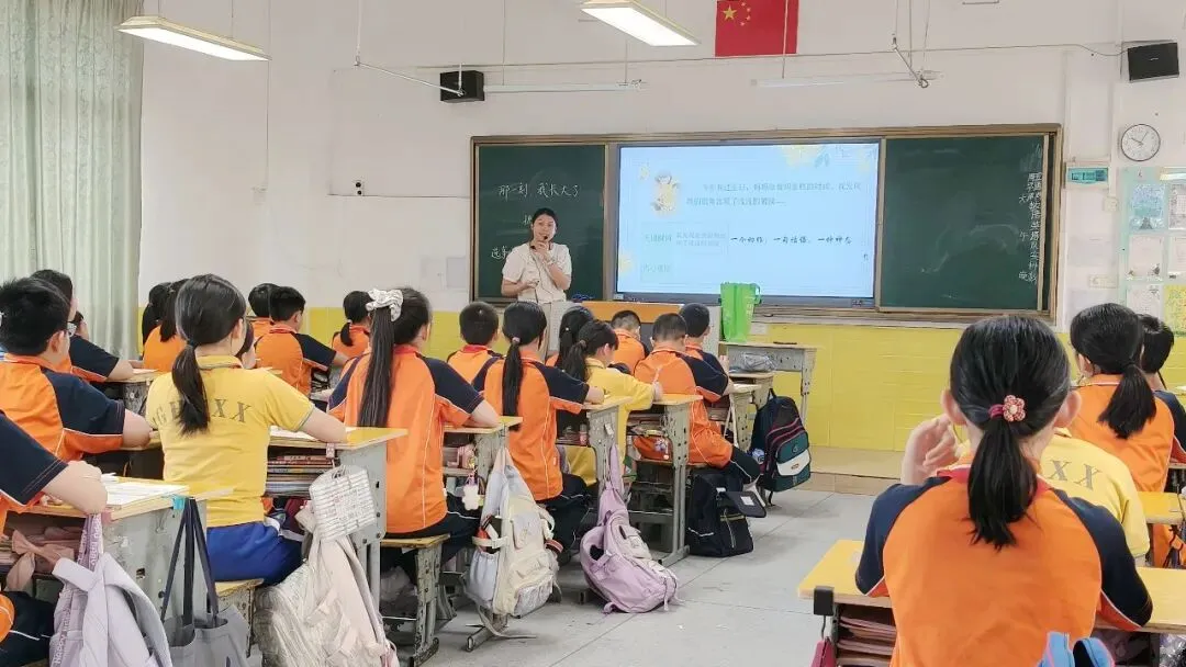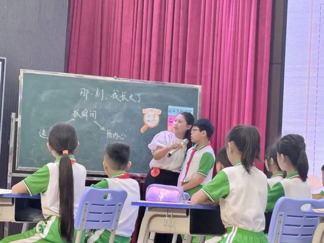 比赛中,曾老师执教《那一刻,我长大了》。她以《成长纪念册》征稿启事为情境主线,引导学生在真实任务中明确写作方向。课堂上,学生先围绕“那一刻”搭建写作框架,在分享互评中厘清思路;随后通过品读范文、小组合作圈画关键词句,逐步提炼出将瞬间写生动的方法。在片段写作与互评展示环节,学生将所学运用于实践,写出真实可感的成长故事。最后,曾老师引导学生进行变式审题训练,实现方法的迁移运用。整节课层层递进,充分体现了“教学评一致性”理念,展现了人工智能赋能下表达类课堂的实践探索成果。