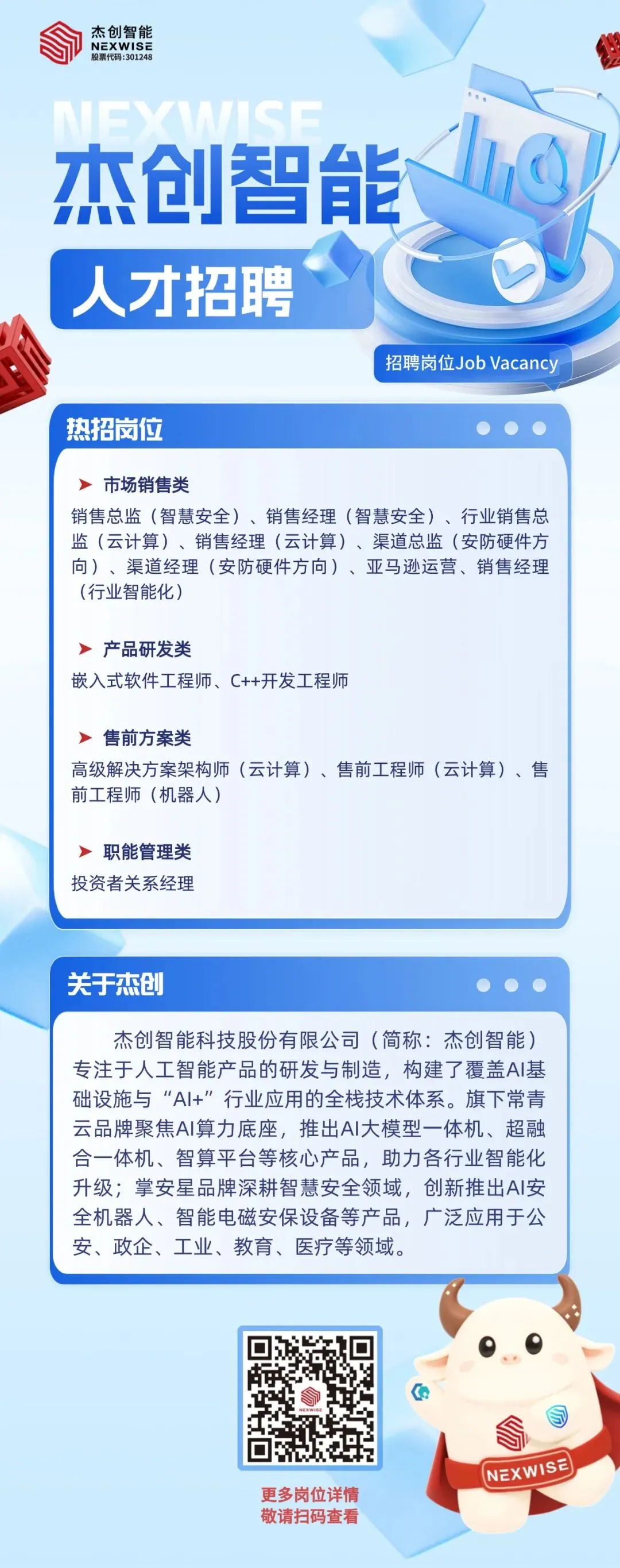杰创智能科技股份有限公司(简称:杰创智能)专注于人工智能产品的研发与制造,构建了覆盖AI基础设施与“AI+”行业应用的全栈技术体系。旗下常青云品牌聚焦AI算力底座,推出AI大模型一体机、超融合一体机、智算平台等核心产品,助力各行业智能化升级;掌安星品牌深耕智慧安全领域,创新推出AI安全机器人、智能电磁安保设备等产品,广泛应用于公安、政企、工业、教育、医疗等领域。