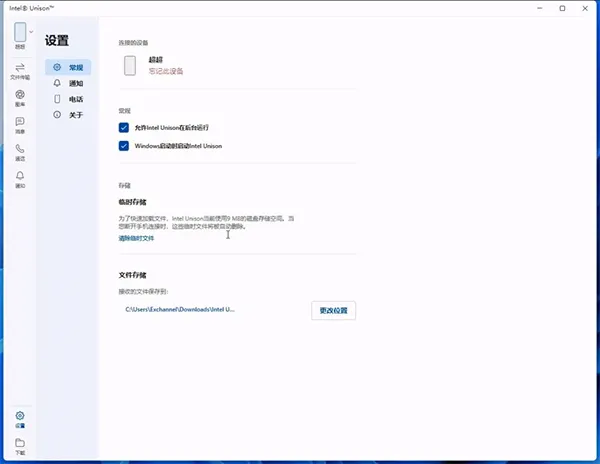 7、设置:该选项下共有四个子项:首先是常规选项:在该子项下可以设置忘记此设备、是否允许Intel Unison在后台运行/开机启动、清除临时文件以及更改接收到的文件存储位置。