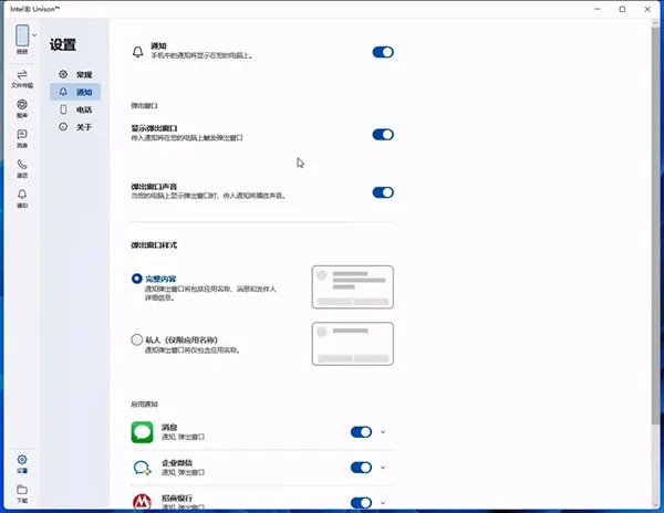 其次是通知选项:在该子项下可以设置是否开启在电脑上显示手机上的通知消息、当有通知消息时是否弹出窗口和提示声音、弹出窗口的样式以及选择需要通知的应用。