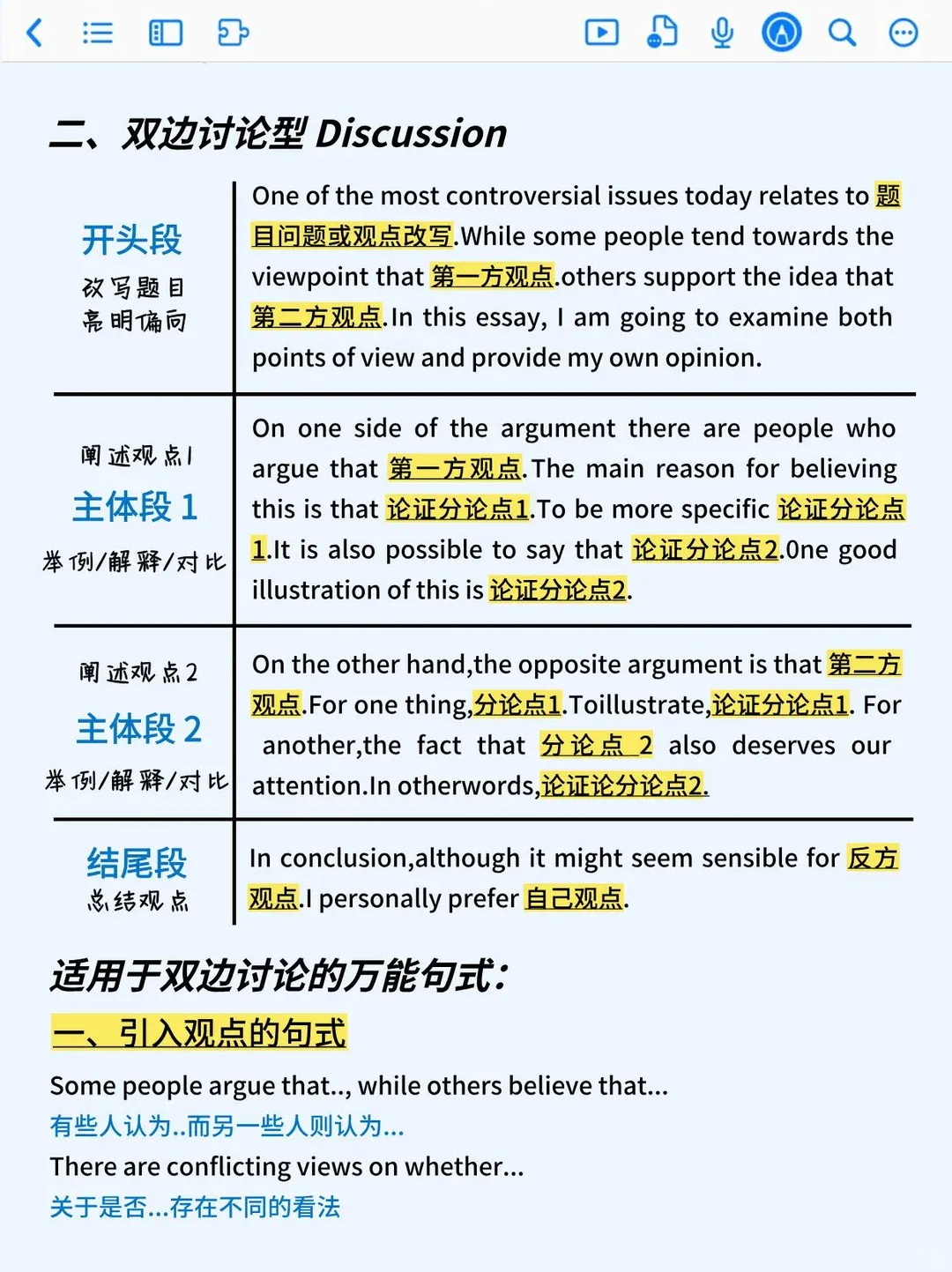 ⭕️这份模板没有晦涩难懂的长难句,基础一般的考生也能快速上手,更关键的是,它覆盖了双边讨论、单边观点、问题解决、双问复合四大核心题型,学会就能应对90%以上的考题。