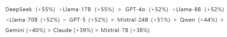 我之前看过一篇关于AI“拍马屁”的排名报道,在日常求建议的场景里,AI的“谄媚度”排行如下: