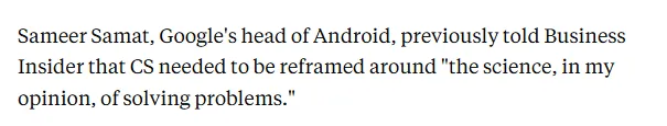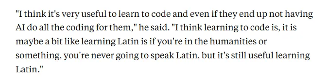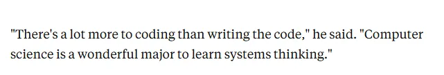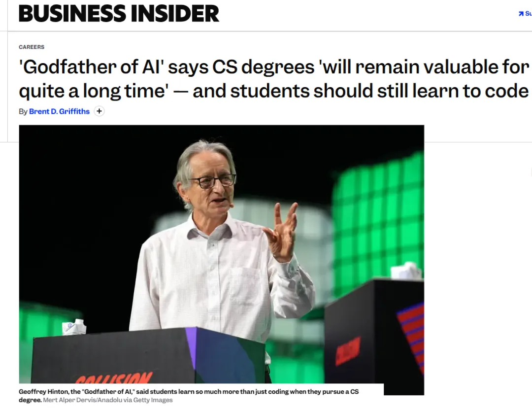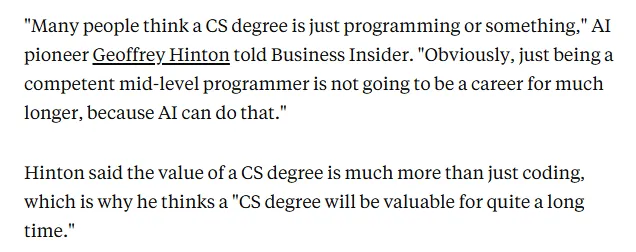 就连 Hinton 本人也明确表示:“显然,仅仅做一名合格的中级程序员,已经不会是一份能做一辈子的职业了,因为 AI 就能做到这一点。但 CS 学位的价值,从来都不止于编码。”