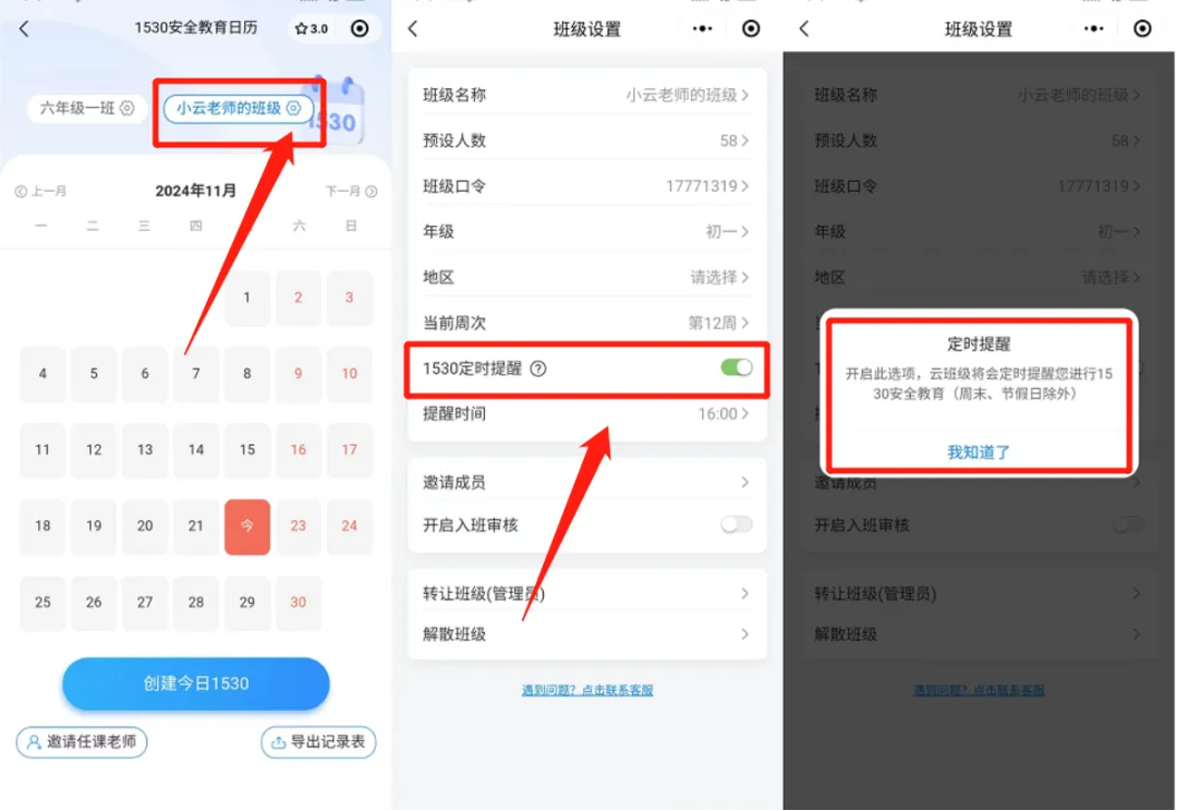 每周【1530】安全教育提醒内容及模板!在当今社会,安全教育已成为学校教育中不可或缺的一部分。为了提高师生的安全意识,预防安全事故的发生,增强自救能力,各地学校都在积极推进和开展“1530安全教育”。通过每天、每周和每次放假前的不同时间段进行安全教育和提醒,帮助学生树立安全第一的观念,时刻关注安全,防范风险,确保学生的人身安全。这时,老师可以使用云班级【1530】功能,来快速发布或留档保存1530安全教育任务!👉点击发布1530安全教育!01 如何使用1530功能? 已关注 关注 重播 分享 赞 视频详情 (点击播放教程)02 如何定时提醒发布 为了避免老师忘记发布当日1530安全任务,云班级1530功能支持定时提醒老师发布方法一:点击1530功能界面顶部班级旁边的设置按钮即可设置是否定时提醒。(点击放大图片查看)方法二:云班级底部班级页面点击班级管理,点击设置按钮即可设置是否定时提醒。(点击放大图片查看)【1530】功能非常实用!✅每日内容自动生成,记录表一键导出~✅系统定时自动提醒发布,不怕遗漏~🔥老师们赶快试试吧!👉点击发布1530安全教育!↓ 点此进入云班级小程序 ↓